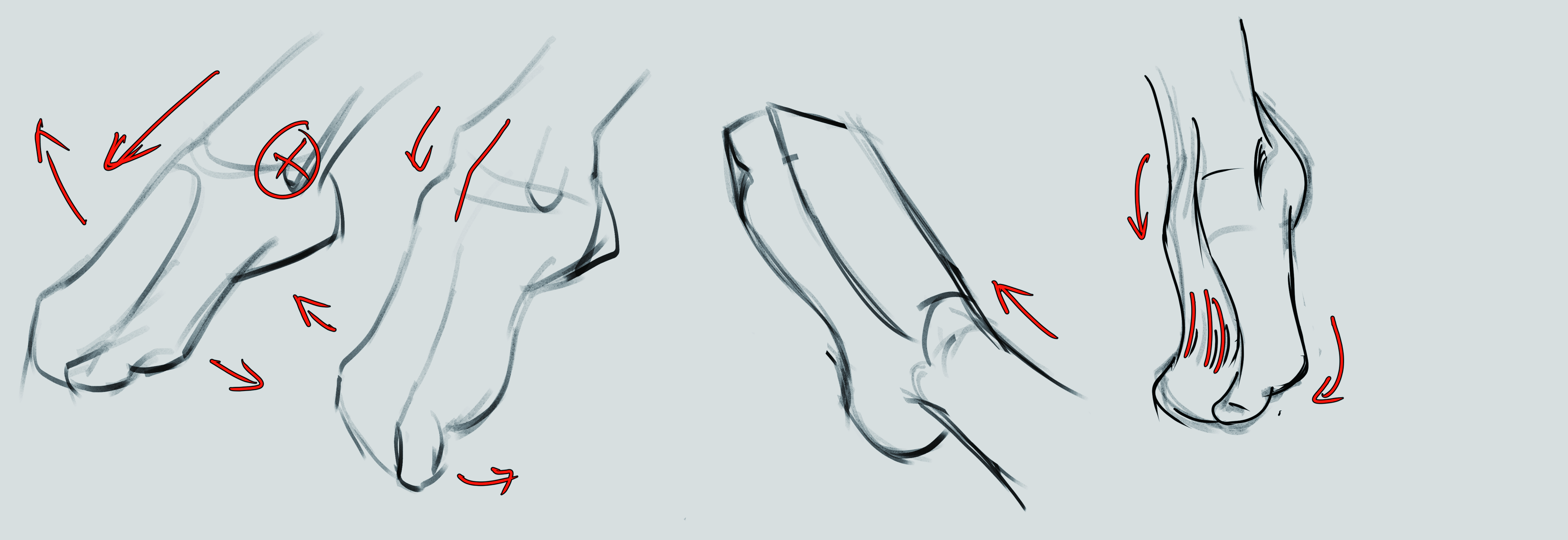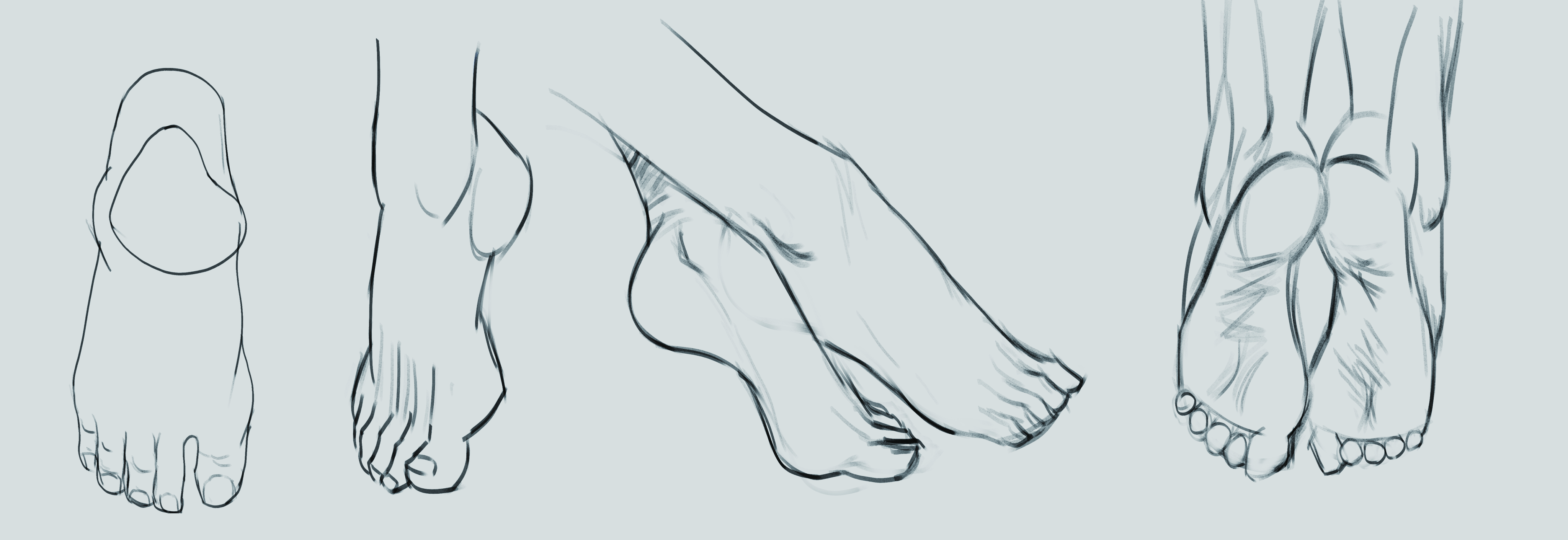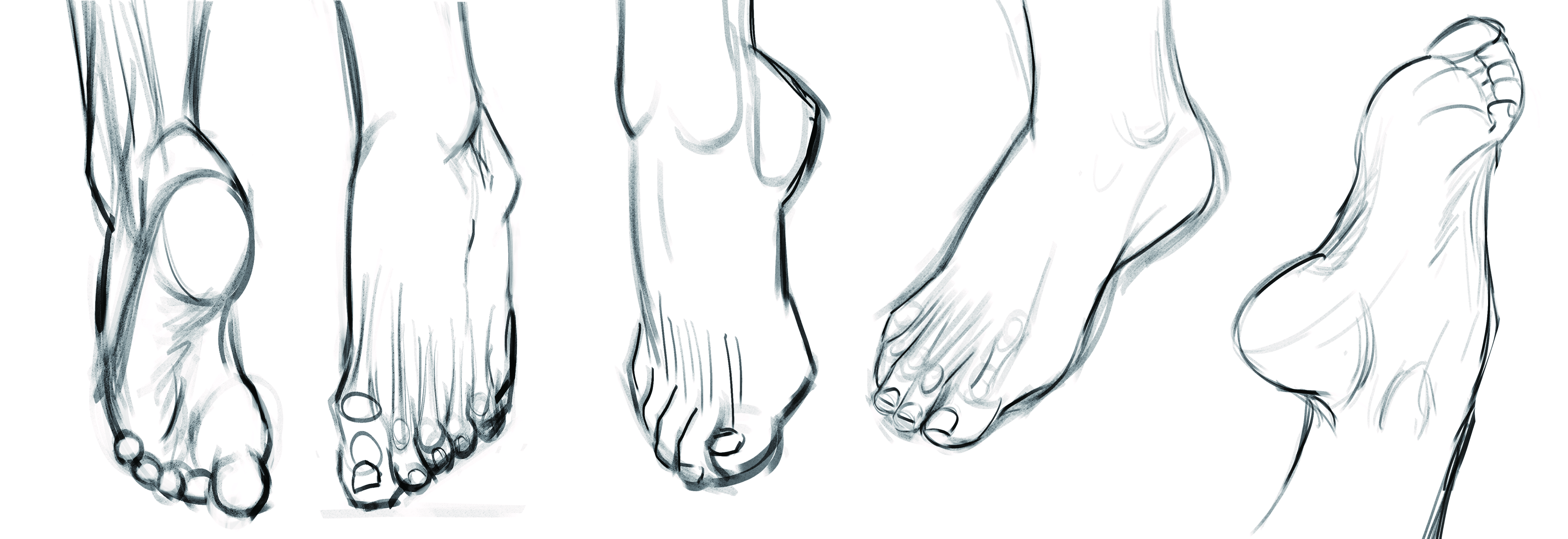 Los pies son más fáciles de dibujar que las manos pues sus movimientos están más limitados, los dedos están alineados, y a pesar de sus múltiples movimientos no pierden su forma básica.