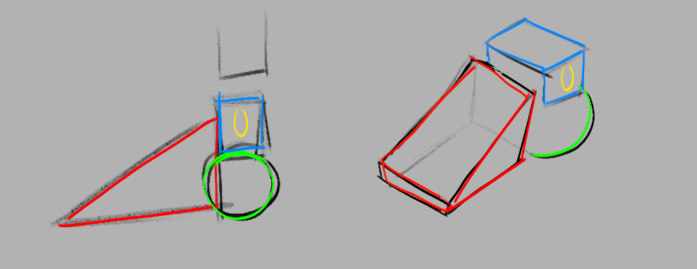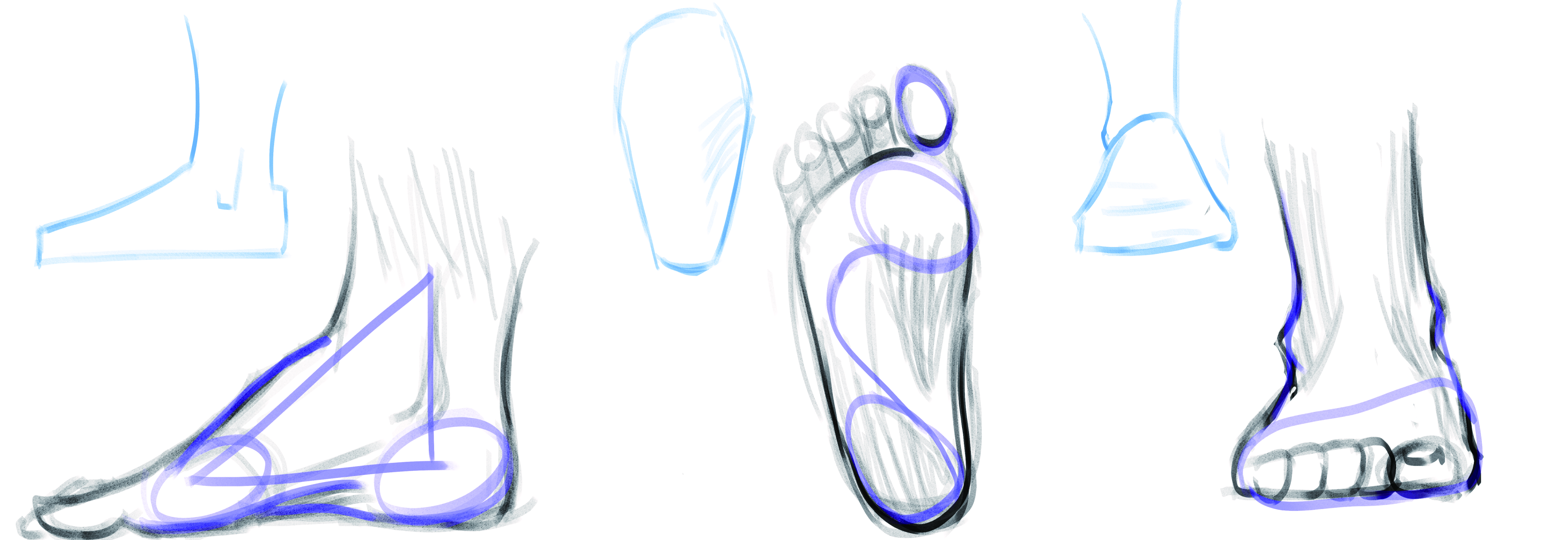 Podemos simplificar los pies en formas básicas de triángulo, círculo y rectángulo. Esto nos ayudará más a comprender y expresar tridimensional.
